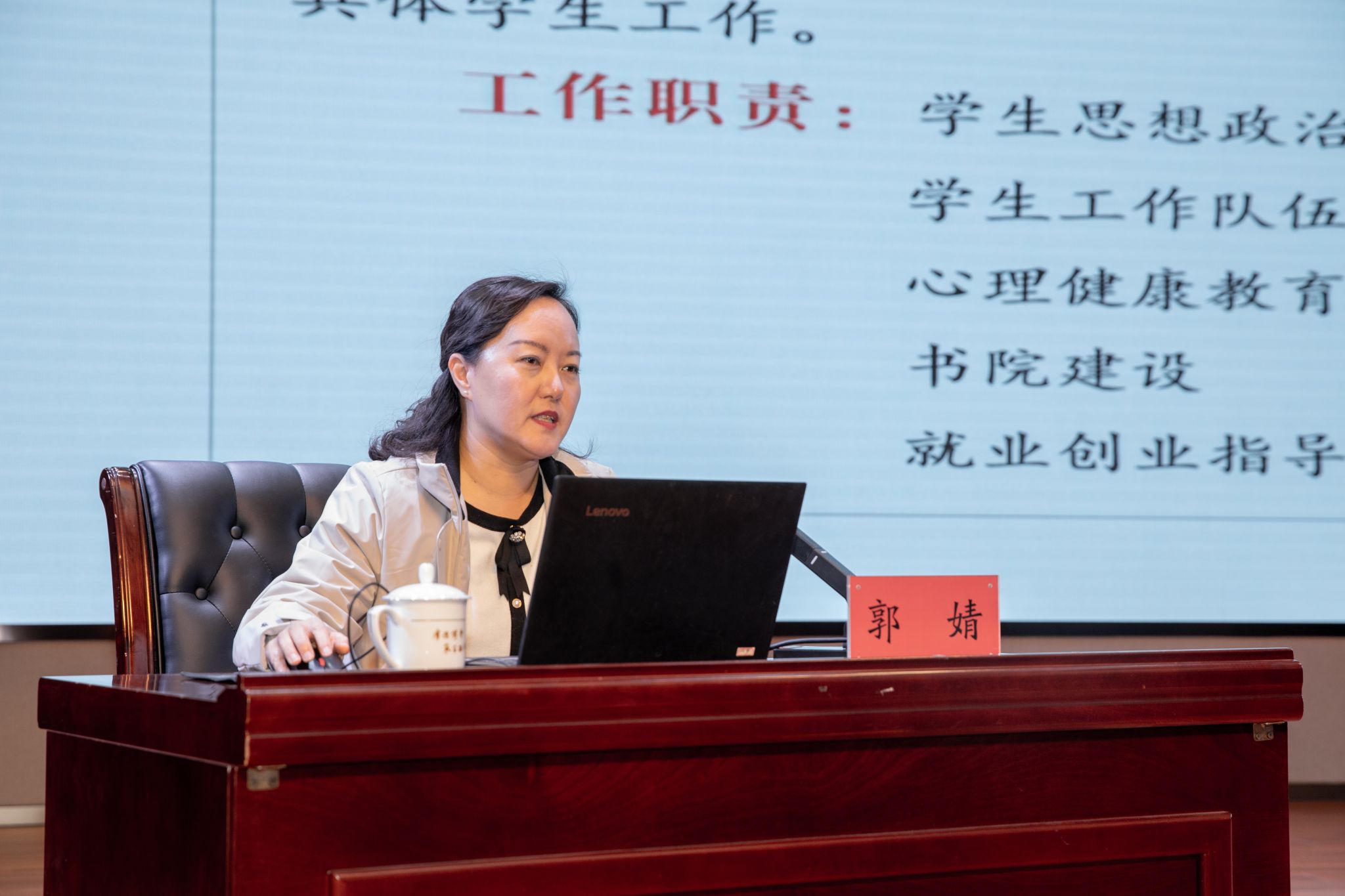郭婧以《凝聚共识 协同发力 三全育人》为题,围绕学工队伍和“一站式”学生社区建设两个方面,简要介绍了学校学工体系构成、学工部的基本情况,重点讲述了“一站式”学生社区的建设背景及历史沿革,以及我校以书院为载体的“一站式”学生社区综合管理模式的体制机制探索,并从校园文化活了起来、小社区释放大能量、学生工作提质增效、试点建设成效显著等方面概括了“一站式”学生社区的建设成效。