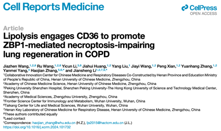 本网讯(文/图 王嘉祯)2024年9月9日,呼吸疾病中医药防治省部共建协同创新中心李建生教授团队在Cell子刊Cell Reports Medicine(中科院分区1区TOP,IF 11.7)发表题为“Lipolysis engages CD36 to promote ZBP1-mediated necroptosis-impairing lung regeneration in COPD”的研究论文,为慢性阻塞性肺疾病(COPD)肺再生缺陷机制提出新见解。