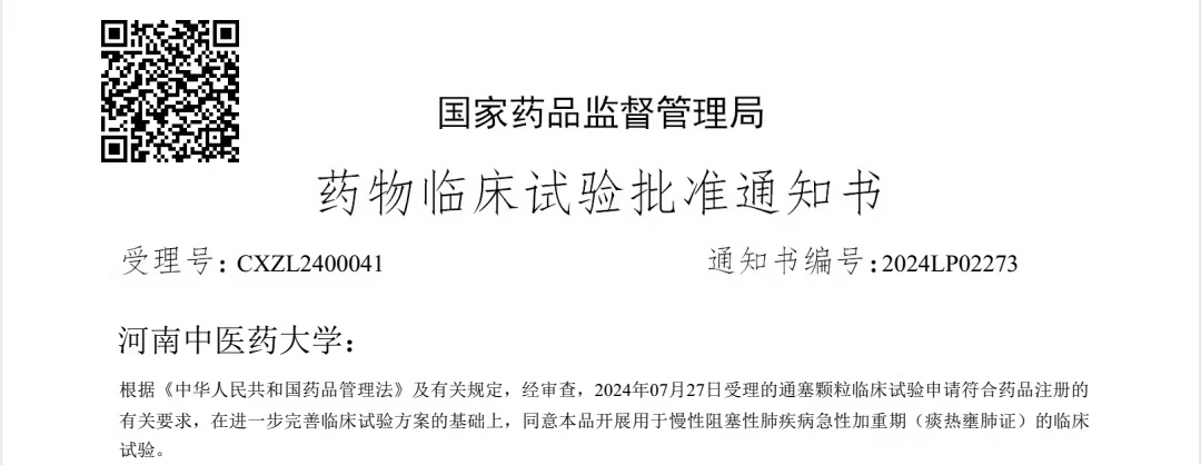 本网讯(文/图 赵迪)2024年10月10日,李建生教授团队自主研发的慢性阻塞性肺疾病(慢阻肺)1.1类中药新药“通塞颗粒”获得国家药品监督管理局药品审评中心(CDE)的临床试验许可,获批在中国开展Ⅱ期临床试验。本次申报获得中国CDE批准,是李建生教授团队继保肺颗粒、益肺济生颗粒两个独创性新药项目获批临床试验批件之外,在探索慢阻肺分期分级治疗药物研发方面取得的又一重要进展。