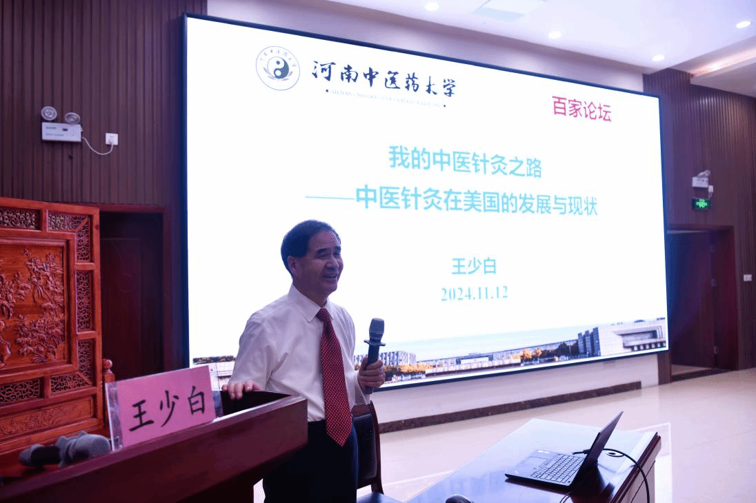 本网讯(文/图 杨旭光)2024年11月12日,美国中医针灸学会会长王少白教授应邀访问我校,并在“百家论坛”上为师生带来了题为《我的中医针灸之路-中医针灸在美国的发展与现状》的学术讲座。米兰体育网页版登录入口,米兰(中国)关工委常务副主任张丽霞、米兰体育网页版登录入口,米兰(中国)关工委常务副秘书长蒋时红以及河南省针灸学会会长、米兰体育网页版登录入口,米兰(中国)教授路玫出席了本次讲座,米兰体育网页版登录入口,米兰(中国)针灸推拿学院师生参加了此次讲座,讲座由米兰体育网页版登录入口,米兰(中国)针灸推拿学院、第三临床医学院执行院长胡斌主持。