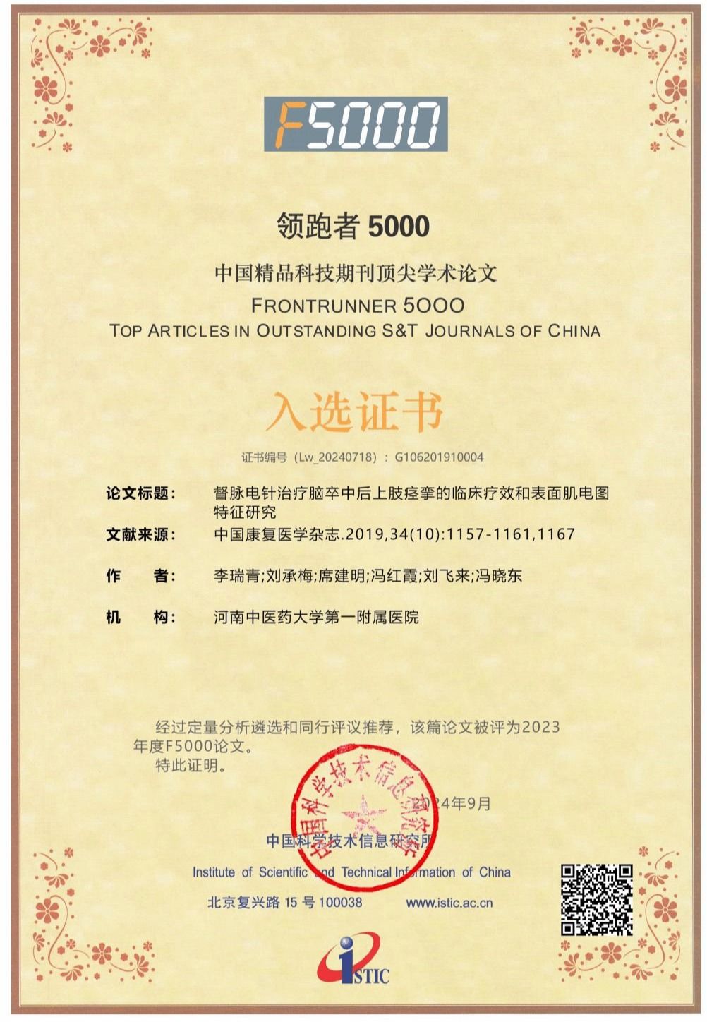 本网讯(文/图 高静)近日,中国科学技术信息研究所评选出“领跑者5000——中国精品科技期刊顶尖学术论文”(简称“F5000”),我校第一附属医院康复诊疗中心冯晓东教授团队论文成功入选2023年度入选名单。