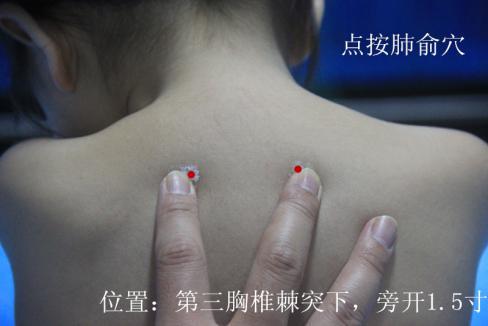 穴位定位:膻中和大椎前面已介绍,肺俞位于第三胸椎棘突旁开1.5寸。