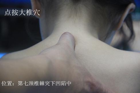 操作:旋转摩法:以手掌掌根部对大椎顺时针快速做圆形摩擦,至少80次/分,以患者感到后背发热,微微汗出为好;挤捏法:双手拇指和食指同时由深层肌肉到浅层皮肤对捏大椎穴处,以皮肤发红甚至出痧,微微汗出为好。此穴是治疗发烧的经验穴,效果非常好。