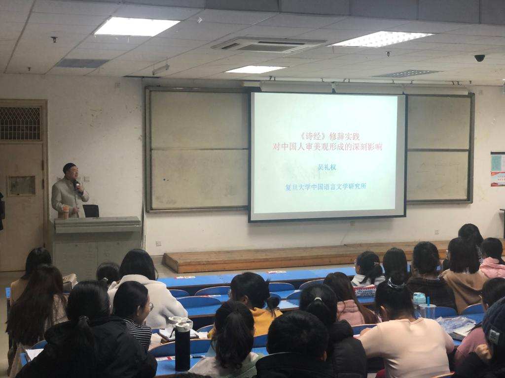讲座中,吴礼权教授主要从汉语修辞史、《诗经》、修辞实践和审美观等四个方面展开讲授。吴礼权教授以通俗易懂的经典诗句为例,结合不同词格特征生动形象地介绍了《诗经》所确立的审美观对中国文学创作的影响,系统梳理了中国人审美观形成过程。吴教授就《诗经》中比喻、列锦、起兴等三个方面进行分析研究。在问答环节,现场师生踊跃提问,现场学术氛围浓厚。