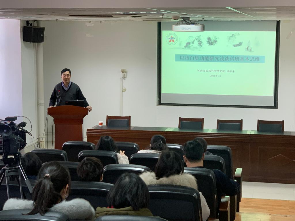 本网讯(文/邵沛璐 图/高妍)2021年1月12日,河南省(郑州大学)医药科学研究院院长、研究员、博士生导师汲振余应邀作客我校百家论坛,以《以蛋白质功能研究浅谈科研基本思维》为题作专题讲座。我校60余名师生聆听讲座,讲座由药学院副院长崔瑛主持。