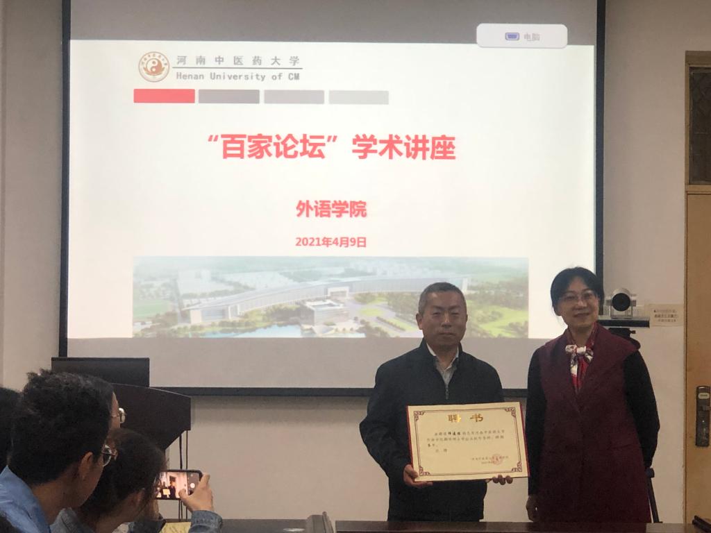 讲座结束后,外语学院郭先英院长为师建胜颁发我校校外导师证书。