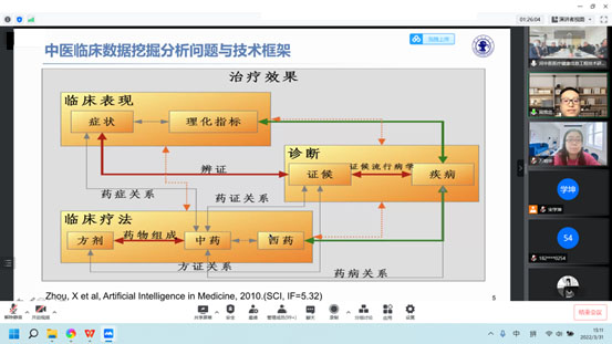 周雪忠教授以“融合网络医学的真实世界中医药数据挖掘方法与创新应用”为题首先开展讲座。他从中医临床数据挖掘研究的问题、价值与挑战,真实世界中医临床数据挖掘研究方法与案例,真实世界中医临床数据挖掘研究趋势与前沿三个角度做了报告,并指出要做好中医药与信息技术的高质量融合发展,高质量闭环临床数据是研究基础,中医学与信息技术的交叉型人才是核心,信息技术与中医多学科合作融合是关键。