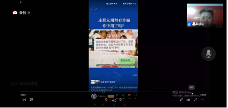 讲座伊始,上官轲轲以强有力的数据展示了当前网络诈骗的现状。随后,上官轲轲从诈骗案件三要素入手,以生动的案例向学院学子讲述了当前大学生最易上当的四大诈骗类型——冒充熟人作案、虚假交易、贷款类诈骗、刷单诈骗,并向广大学子教授反诈骗小技巧。同时,通过生动的案例向广大学子剖析了诈骗案件的各环节并提出防范建议,希望大家能够加深对各类诈骗的了解,真正做到反诈骗、不被骗,决不能为一时利益出卖个人信息,无论何时都应保护好个人信息。