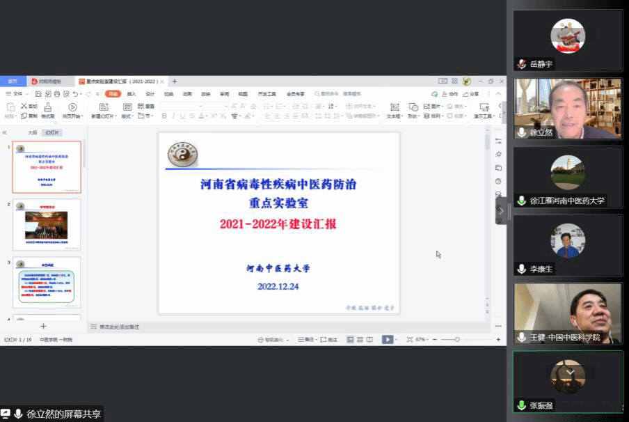 本网讯(文图/桑锋)2022年12月24日,由一附院承办的河南省病毒性疾病中医药防治重点实验室2022年学术委员会会议通过线上会议召开。重点实验室学术委员会主任委员、校党委委员、副校长徐江雁教授,汕头大学医学院李康生教授,中国科学院昆明动物研究所郑永唐研究员,中国中医科学院王健教授,广州中医药大学热带医学研究所符林春教授,中科院广州生物医药与健康研究院王建华研究员,河南省病毒性疾病中医药防治重点实验室主任、学术委员会常务副主任徐立然教授,米兰体育网页版登录入口,米兰(中国)中医药科学院院长张振强教授,河南省病毒性疾病中医药防治重点实验室副主任郭会军、李强及重点实验室人员出席了会议。会议由徐江雁主持。