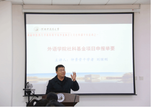 本网讯(文/图 闫舒瑶)2023年11月21日,我校仲景骨干学者刘继刚教授做客外语学院“百家论坛”,为全体教师做了题为“外语学院社科基金项目申报举要”的学术讲座。论坛由外语学院院长郭先英主持。