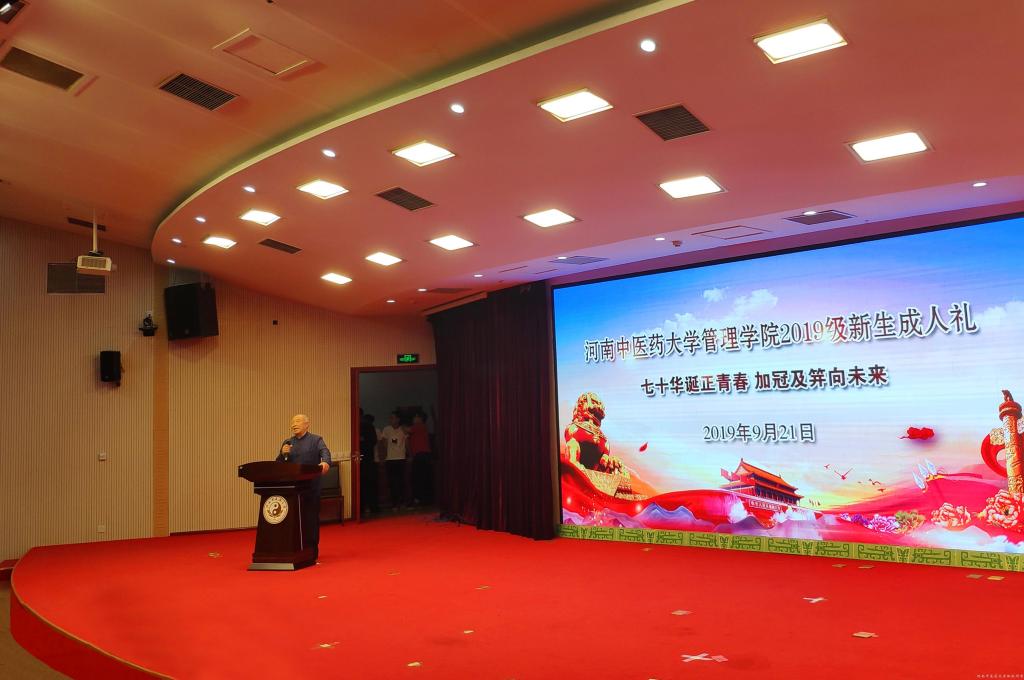 本网讯(文图/杨文君)“古有冠笄之礼,今有成人仪式”。在新中国成立70华诞即将来临、“不忘初心、牢记使命”主题教育扎实推进之际,2019年9月21日下午,管理学院“七十华诞正青春,加冠及笄向未来”2019级新生成人礼活动在图书馆第一报告厅顺利举办。全国中医典籍与语言文化研究专家学术传承与人才培养首批专家、河南省儒医文化研究会会长许敬生教授和管理学院领导班子全体成员、我校中医医史文献学科教师代表及管理学院教师代表、全体辅导员、新生家长代表、2019级全体新生等300余人参加活动。