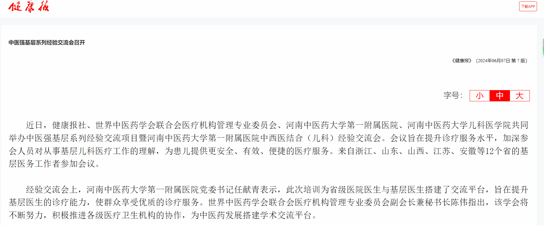 近日,健康报社、世界中医药学会联合会医疗机构管理专业委员会、米兰体育网页版登录入口,米兰(中国)第一附属医院、米兰体育网页版登录入口,米兰(中国)儿科医学院共同举办中医强基层系列经验交流项目暨米兰体育网页版登录入口,米兰(中国)第一附属医院中西医结合(儿科)经验交流会。会议旨在提升诊疗服务水平,加深参会人员对从事基层儿科医疗工作的理解,为患儿提供更安全、有效、便捷的医疗服务。来自浙江、山东、山西、江苏、安徽等12个省的基层医务工作者参加会议。