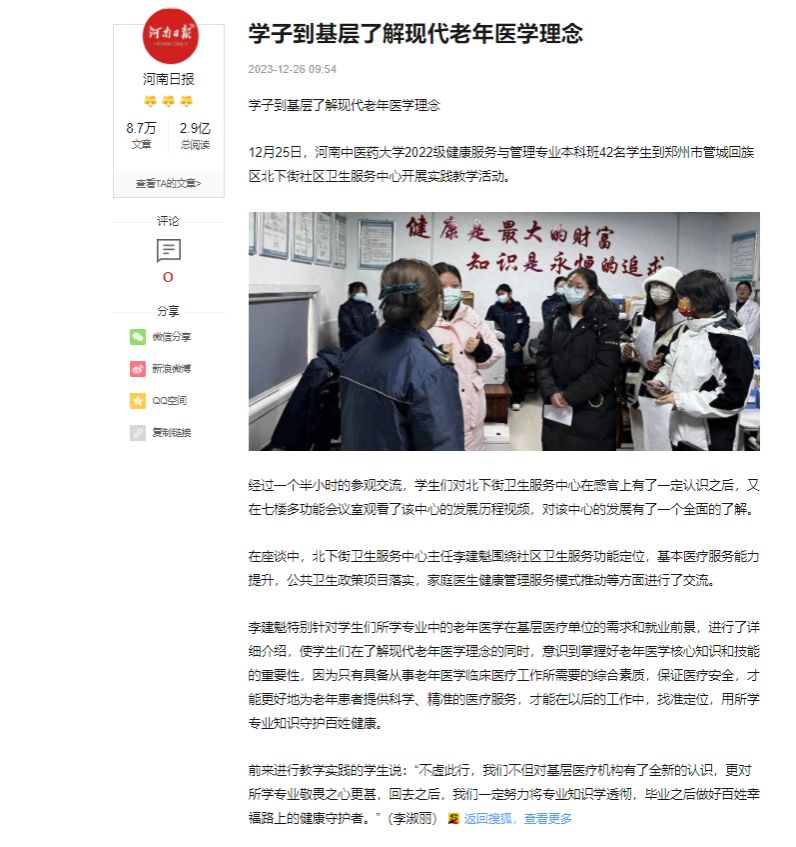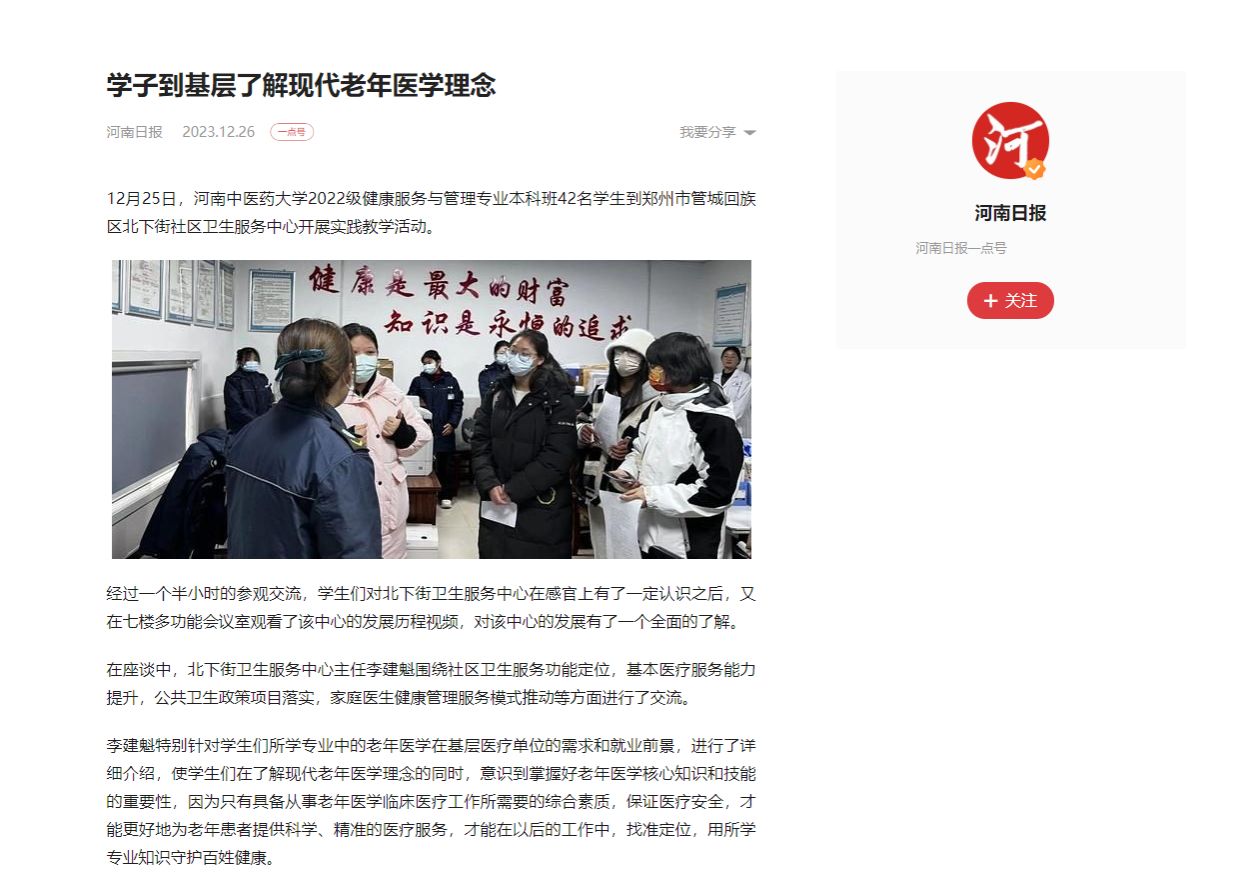 12月25日,米兰体育网页版登录入口,米兰(中国)2022级健康服务与管理专业本科班42名学生到郑州市管城回族区北下街社区卫生服务中心开展实践教学活动。