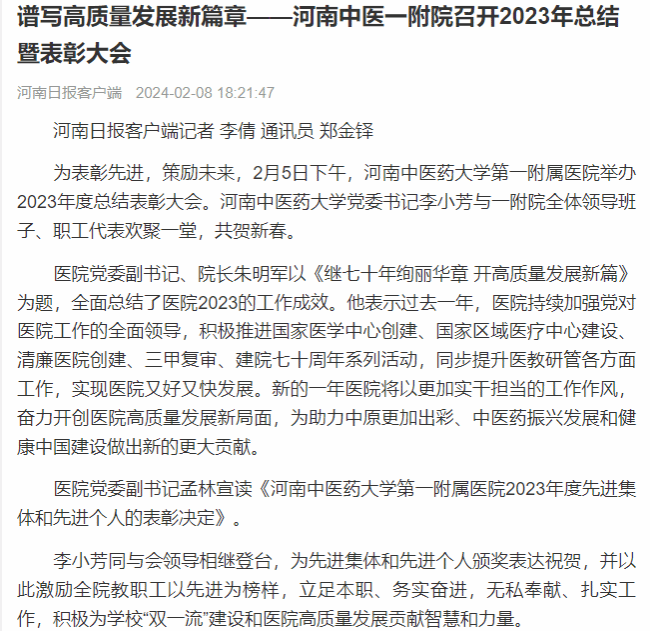 河南日报丨谱写高质量发展新篇章——河南中医一附院召开2023年总结暨表彰大会