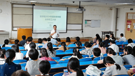 本网讯(文/王坦 图/李光)2024年9月1日,医学院在教学实验楼四楼阶梯教室召开2024年秋季学期工作会,学院全体教职工参会。会议由学院党委书记高剑峰主持。