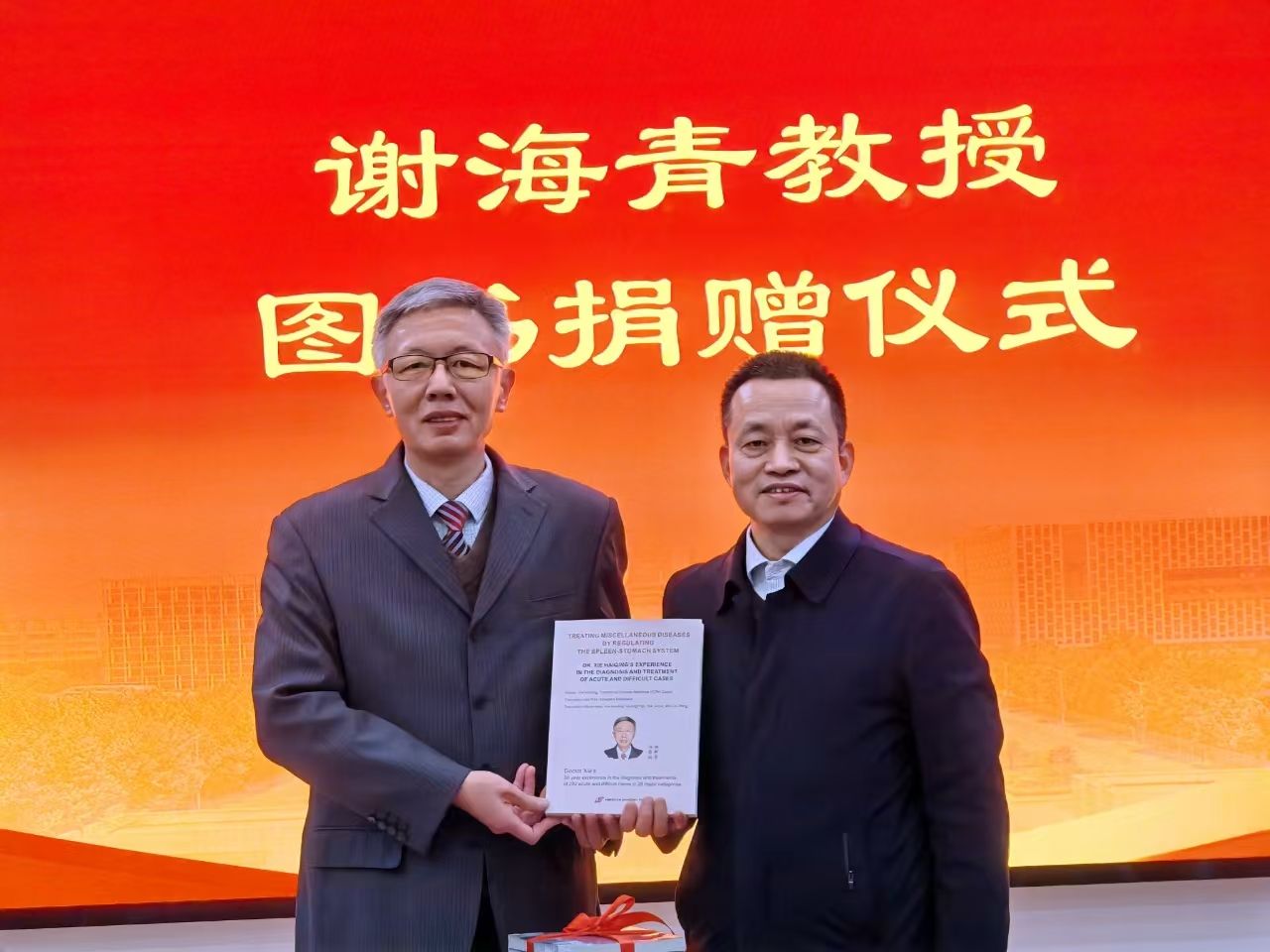 本网讯(文/图 郭豪)冬藏神州蓄锐日,春晖大地报恩时。2024年12月17日,国医大师李振华教授关门弟子、我校84级校友谢海青教授向我校图书馆捐赠《调脾胃治杂病——谢海青急症疑难病诊疗经验专辑》中文版15册、英文版1册,图书馆馆长何明举接收捐赠图书并颁发了捐赠证书。图书馆副馆长吴晓萍、范文博及社会合作办公室校友与社会合作科科长陈晓辉、图书馆办公室、图书馆采编部有关同志参加了捐赠仪式。