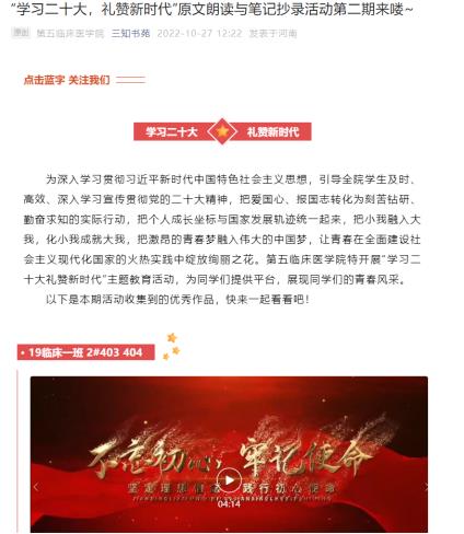 互动交流齐分享,同心同行聚合力。在青马学员主题分享活动中,2019级临床医学本科生、全国青马学员高洋博以“促进中医药传承创新发展”为切入点,在全国“青马工程”高校班“宣贯党的二十大、青马学员说”研讨宣讲会上分享学习收获,引起共鸣。“新征程中新青年,奋进路上勇担当”线上座谈会中,党员同志结合自身经历与医学专业特色踊跃分享,表达心声、汲取力量、激发斗志、展望未来。知识竞赛促学促行,11月11日,学院开展了党的二十大精神专题知识竞赛,强化学习内容,推动党的二十大精神入脑入心。