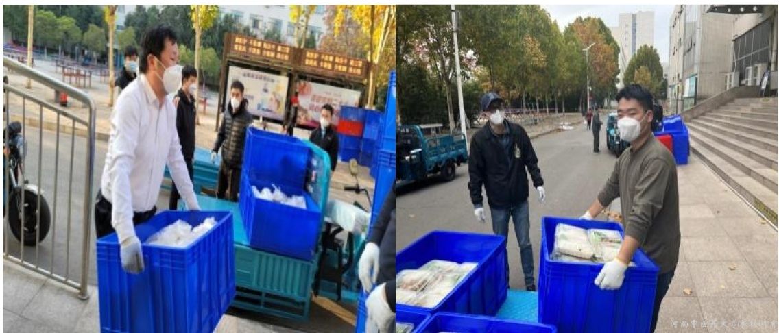 志愿服务甘于奉献。志愿者们团结互助、高效合作。李国志博士和郭寅虎两名同志与其他老师一起负责把2174名学生的餐食从食堂三楼转运到一楼,每餐都要搬运食物近一百筐,亲身体会到晚上送餐服务工作后,浑身疼痛,连鞋都脱不下来的感受。马赟、许成刚、王晓燕、肖俊生、种大双5名党员与其他学院老师一起承担每日为2000多名学生的送餐任务和垃圾清运。老师们“搬运工”“分餐员”“送餐员”教师身份无缝对接,第一时间将热腾腾的饭菜送到各个宿舍,深夜他们又为了第二天的课程认真备课。校级样板党支部教学实验中心党支部书记高志宇老师,在隔离酒店为200名隔离学生服务,组织核酸检测、统计调度配餐、进行物资保障、酒店协调、监控巡查等工作,同时更重要地是还要时刻做好每位学生的心理健康保障和问题疏导工作。大家一致认为:“疫情防控最终将会是一个胜利的故事,做为学校疫情防控队伍中普通一员,能亲历这个故事的一部分,是永远值得自豪的!”