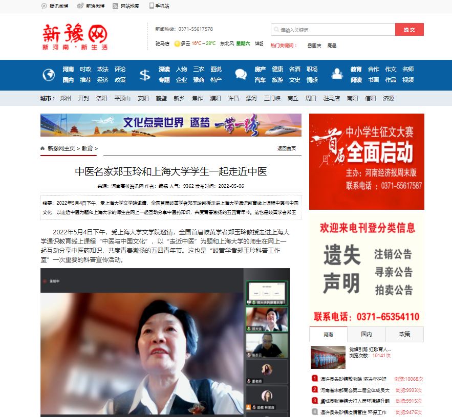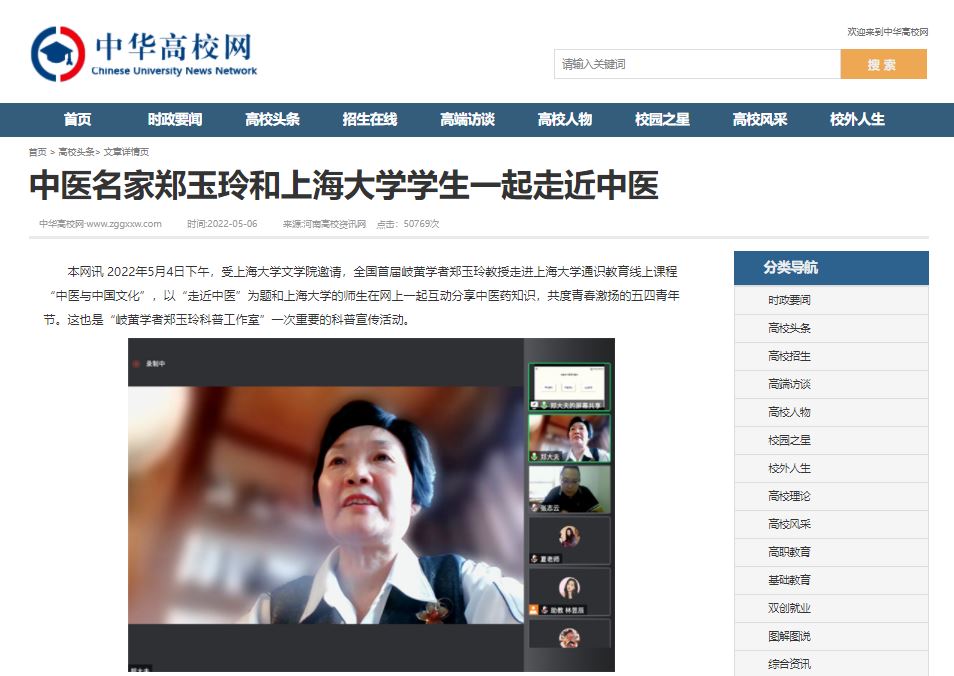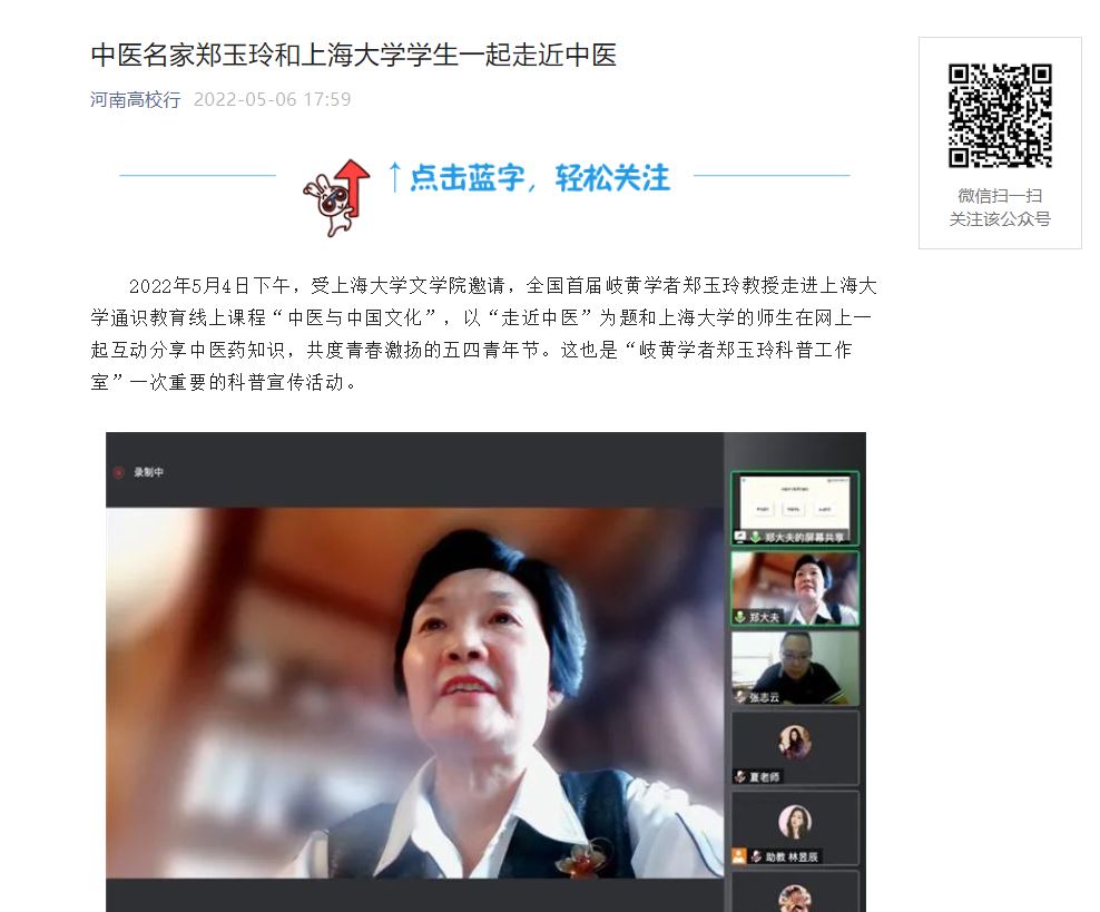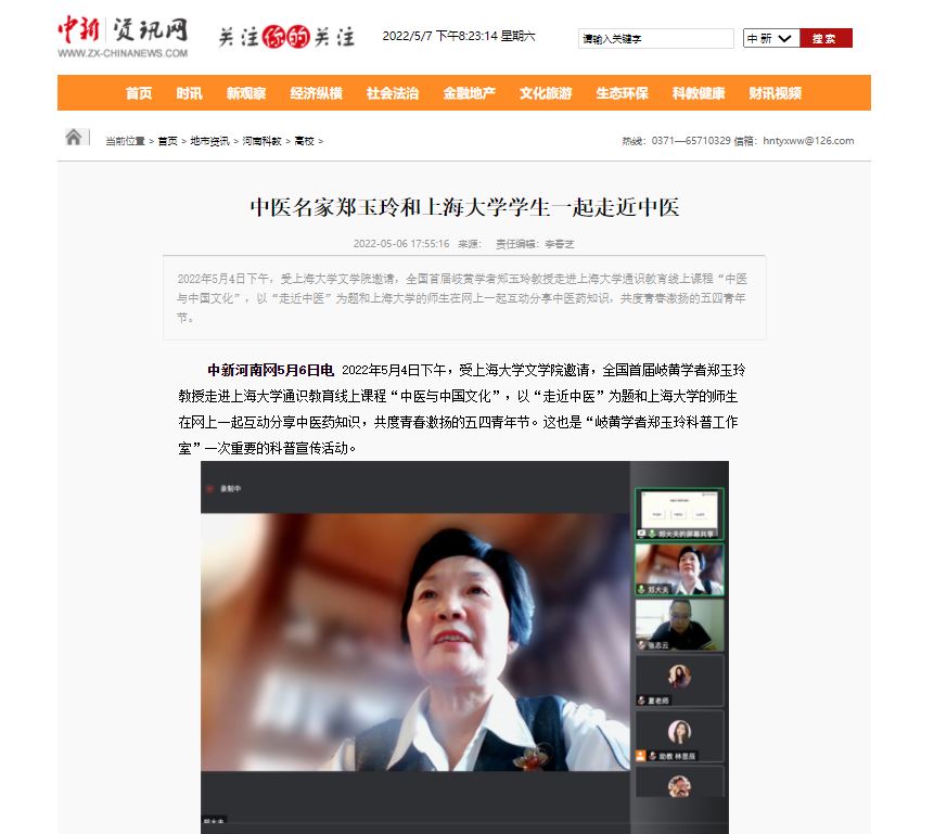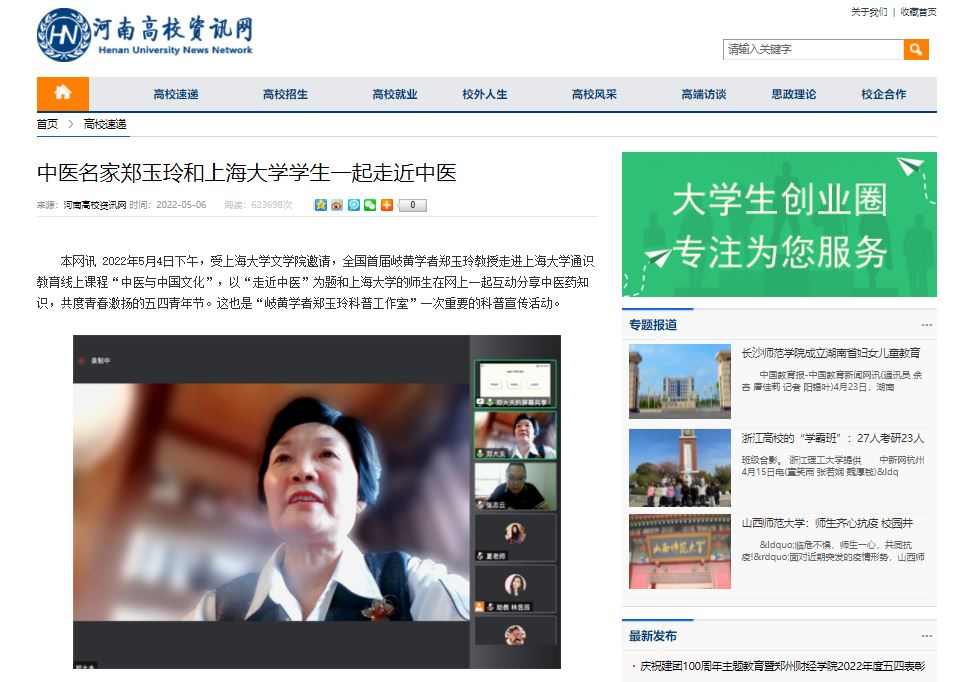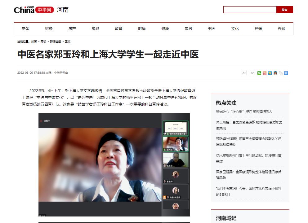 编者按:2022年5月6日,中华网、中华高校网、中新网、河南高校资讯网、新豫网、河南经济论坛、河南高校行等多家媒体对全国首届岐黄学者、我校郑玉玲教授和上海大学学生一起走近中医进行报道。