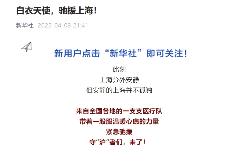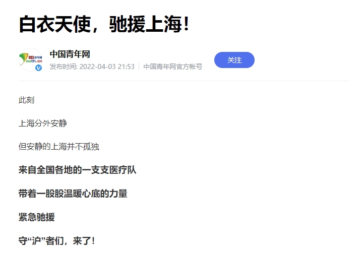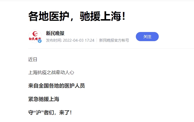 2022年4月3日,新华社官方微信公众号、中国青年网、新民晚报等多家媒体对河南医护人员驰援上海进行报道。
