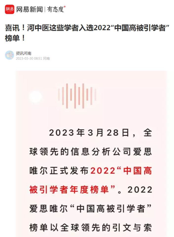 网易新闻丨喜讯!河中医这些学者入选2022“中国高被引学者”榜单