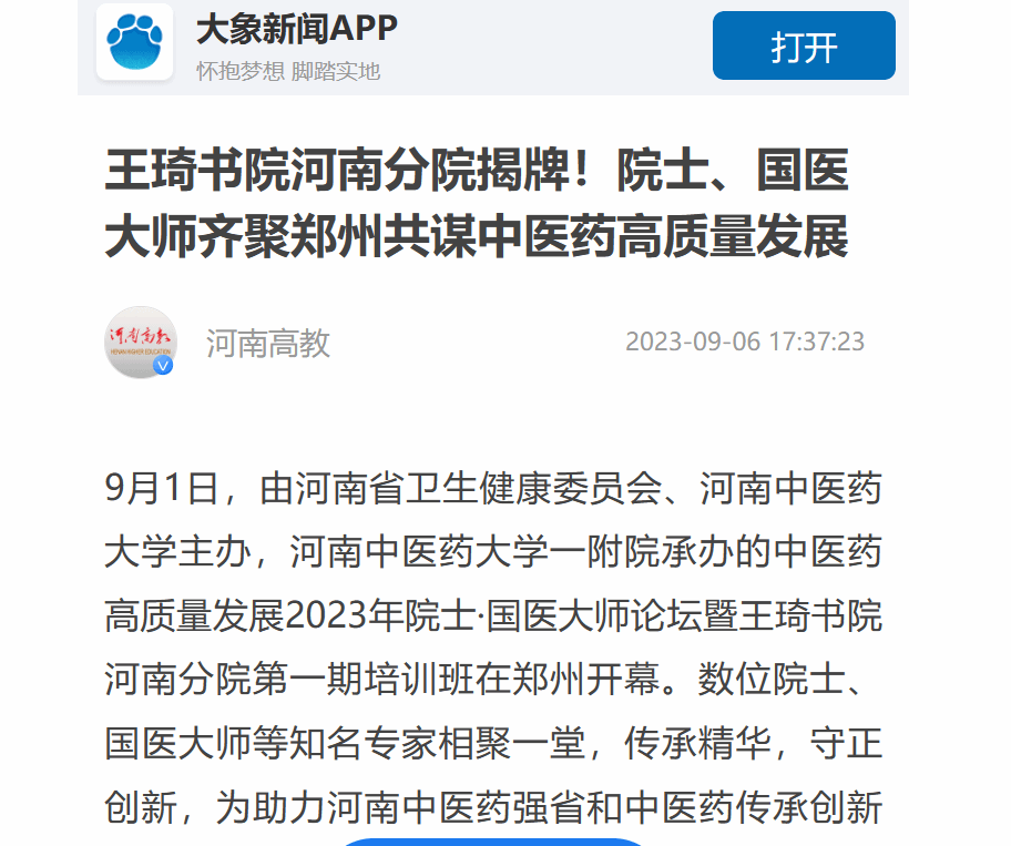 河南日报等丨王琦书院河南分院揭牌!院士、国医大师齐聚郑州共谋中医药高质量发展