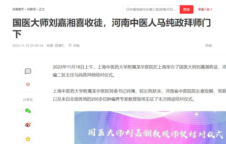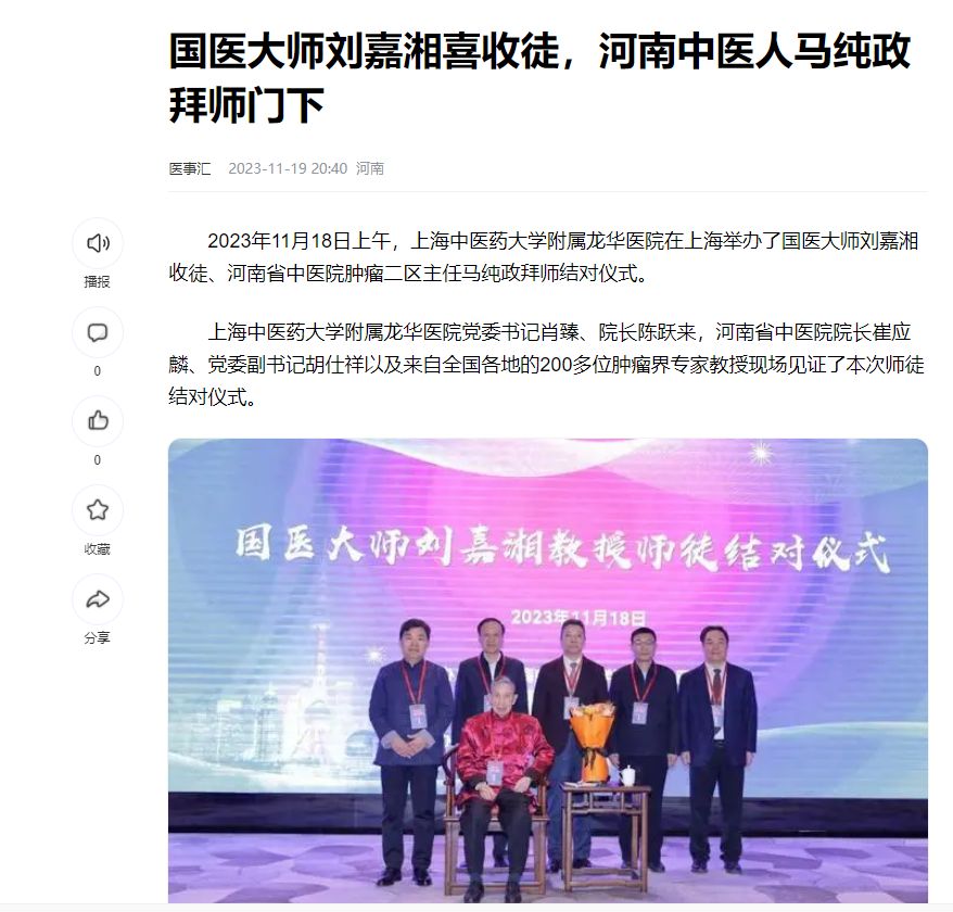 2023年11月18日上午,上海中医药大学附属龙华医院在上海举办了国医大师刘嘉湘收徒、河南省中医院肿瘤二区主任马纯政拜师结对仪式。